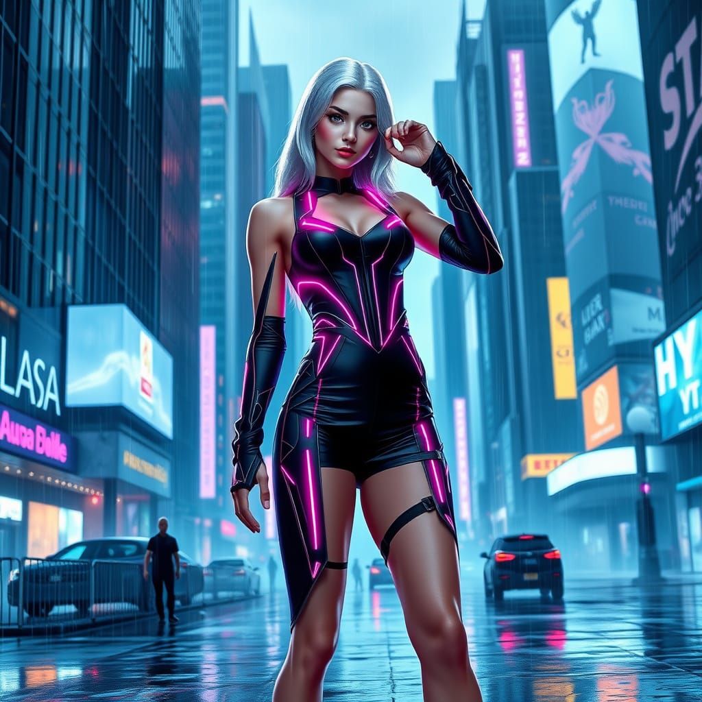 This image depicts a heroic figure standing in a dystopian city, surrounded by towering skyscrapers and holographic advertisements, with a vibrant, neon-lit color palette and intricate details.
