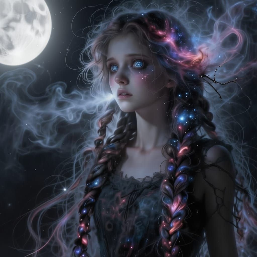 A haunting surreal image of a girl with galaxy braids in a void, surrounded by nebulae and fractured moons. Features bioluminescent tones and cosmic horror elements, depicting celestial decay.