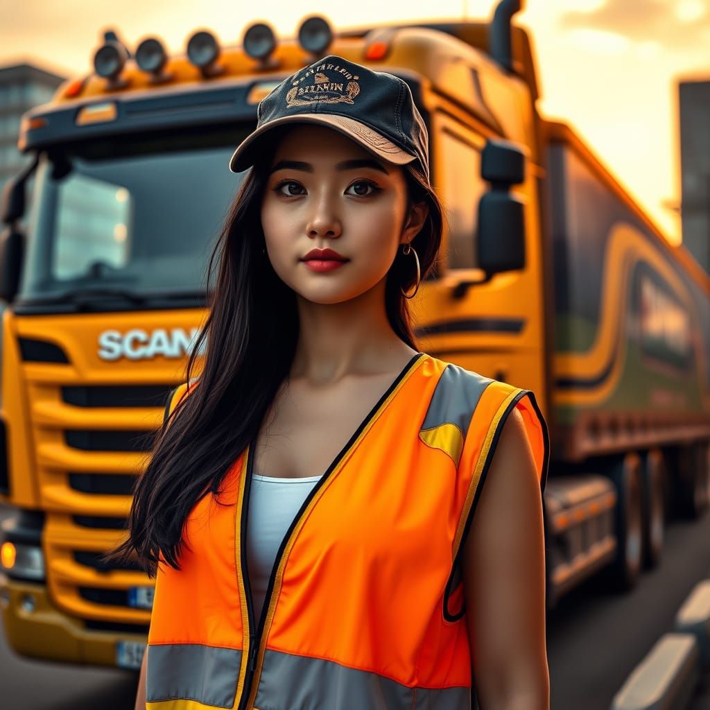 A striking picture of a Korean woman trucker in work gear posing in front of her Scania truck. The image features cinematic photorealism with warm sunset colors and a gritty texture.