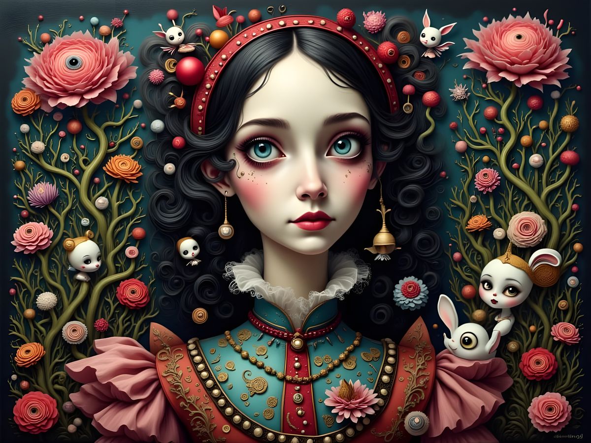 This image depicts Alice in Wonderland Syndrome with a gothic surrealist style. It is a colorful, whimsical, and hyper-detailed oil on canvas artwork with harmonious gothic overtones.