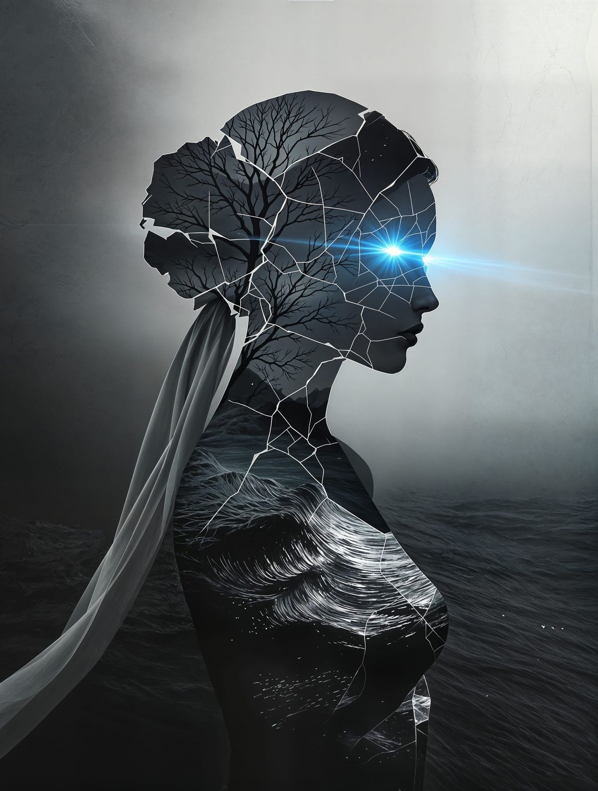 This striking artwork combines a broken female form with natural motifs and stained glass details against a turbulent ocean backdrop, evoking a sense of mystique and power.