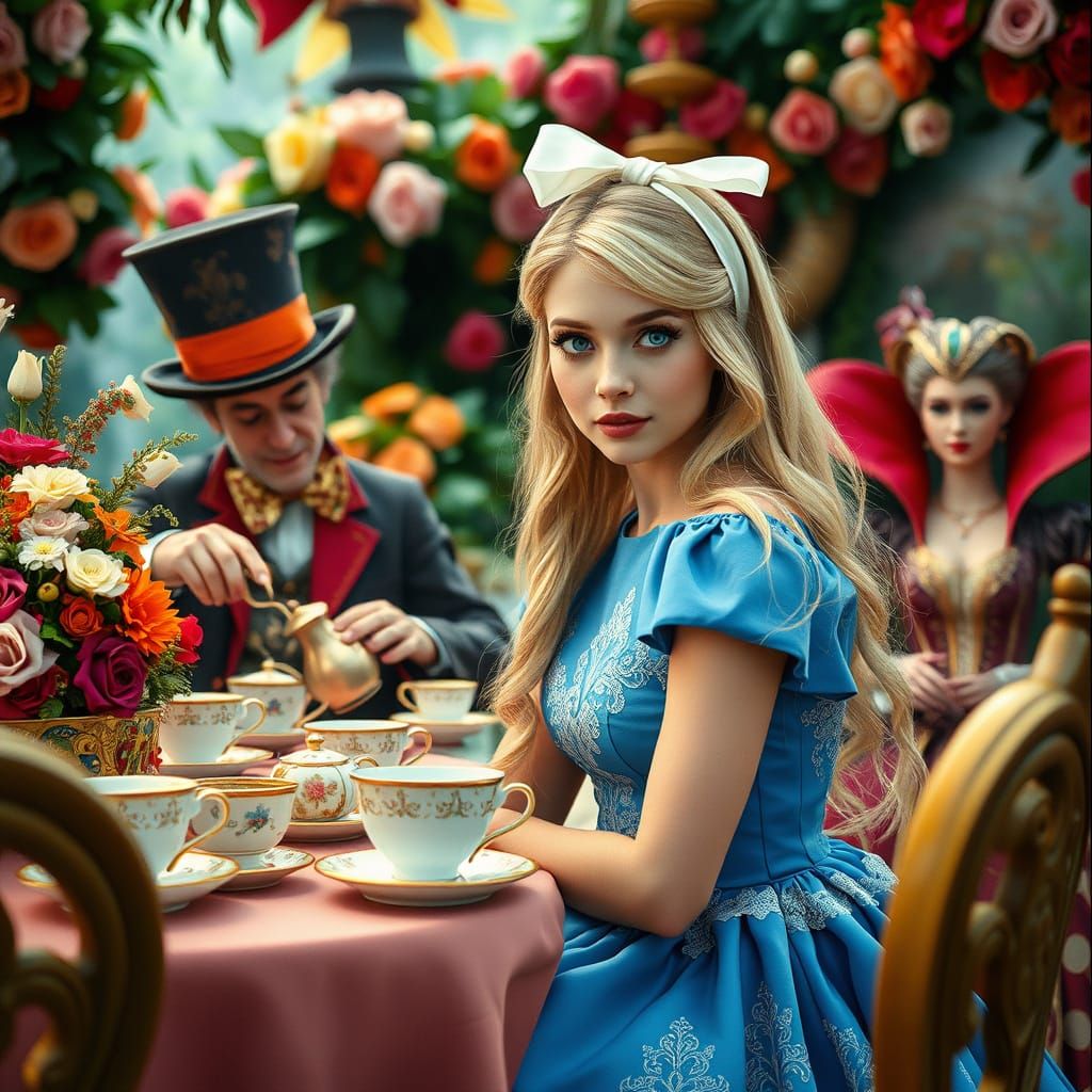 This enchanting scene depicts a beautiful woman, Alice, at a fantastical tea party in a lush wonderland. Surrounded by oversized floral arrangements and teacups that defy gravity, she sits with the eccentric Mad Hatter and ruthless Queen of Hearts. Shot in a cinematic style inspired by Hayao Miyazaki, Ti...