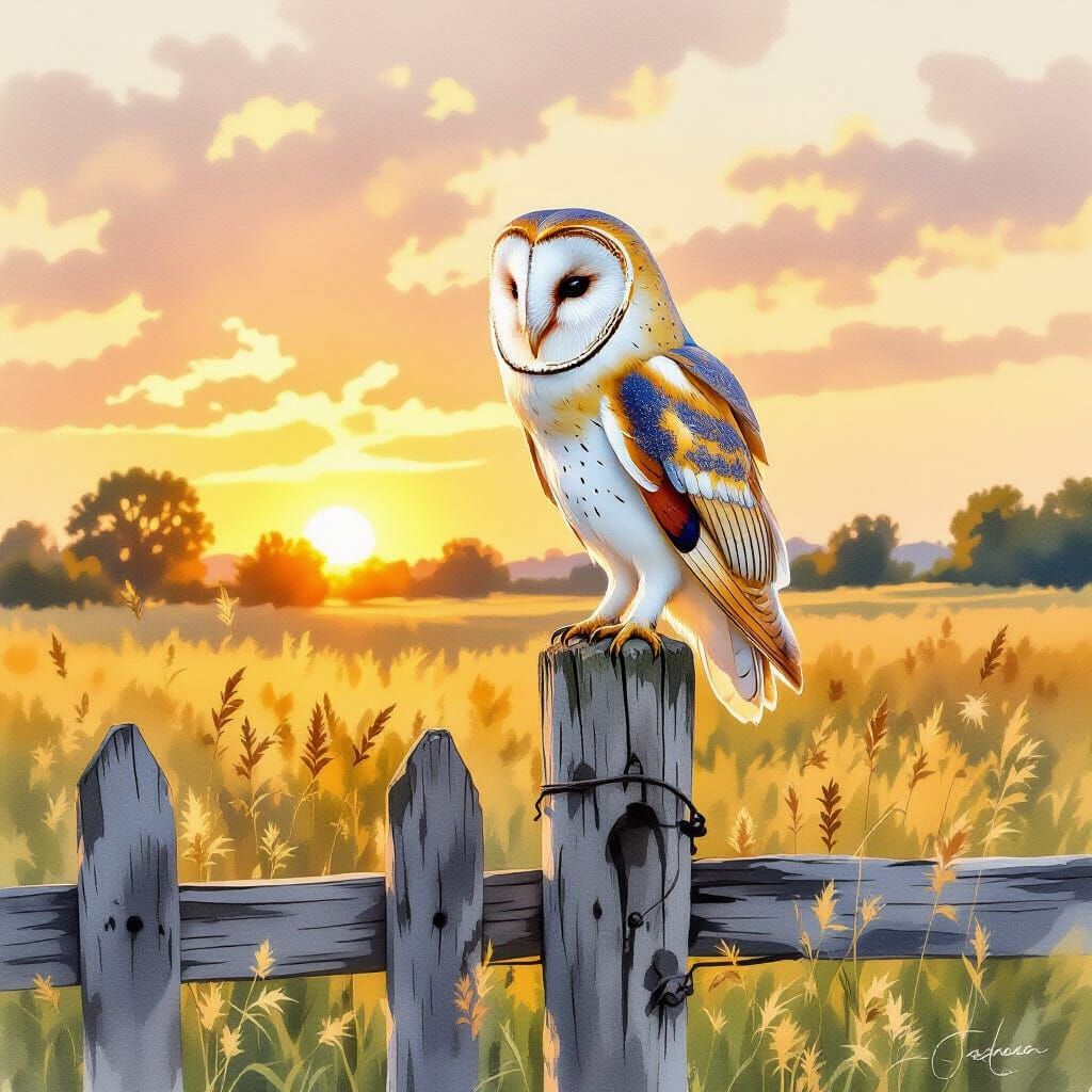 This image depicts a majestic barn owl on a fence post during golden hour. Rendered with delicate watercolor techniques and soft, vibrant colors, it evokes a peaceful ambiance.