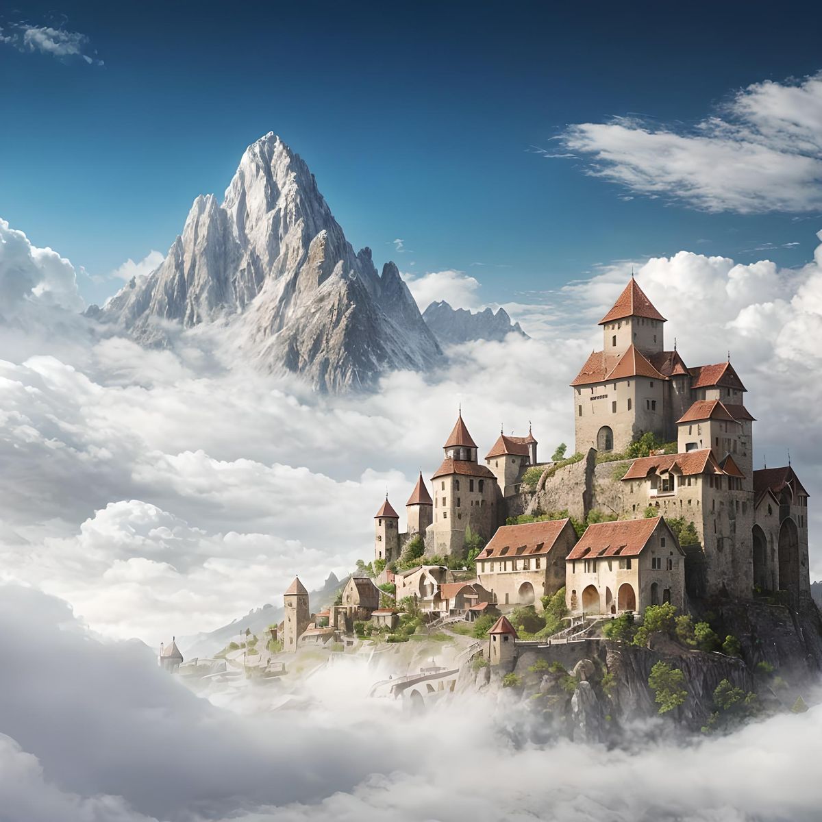 A vibrant medieval town nestled around a majestic mountain with stairs leading to the cloud-hidden peak. Bathed in sunlight with silver clouds, this digital matte painting evokes a cozy, cinematic atmosphere.