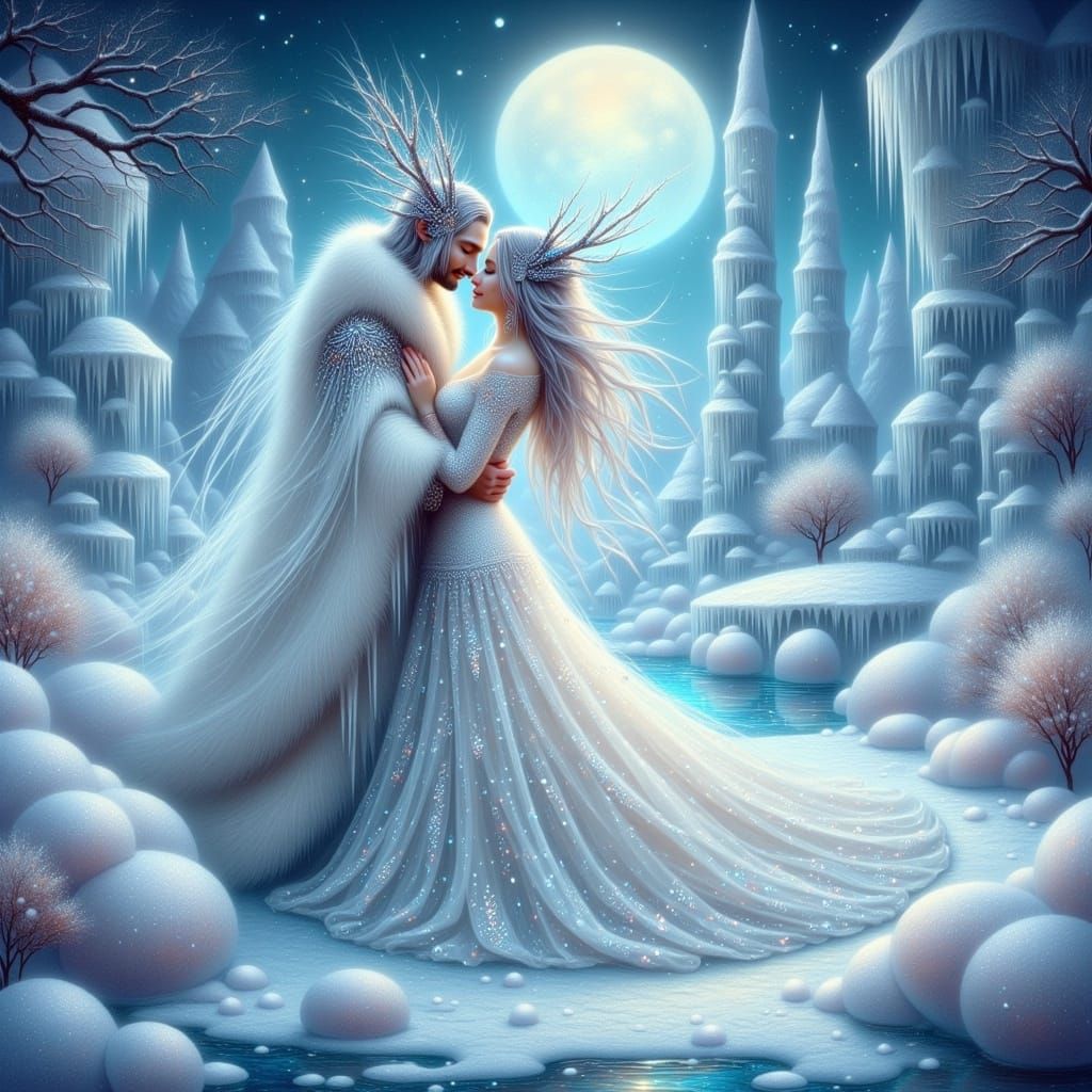 This image shows two ethereal elves dancing on a frozen lake under the moonlight. Crystalline ice formations surround them as snowflakes fall. The romantic scene is rendered with soft brushstrokes and iridescent colors, in a fantastical style.