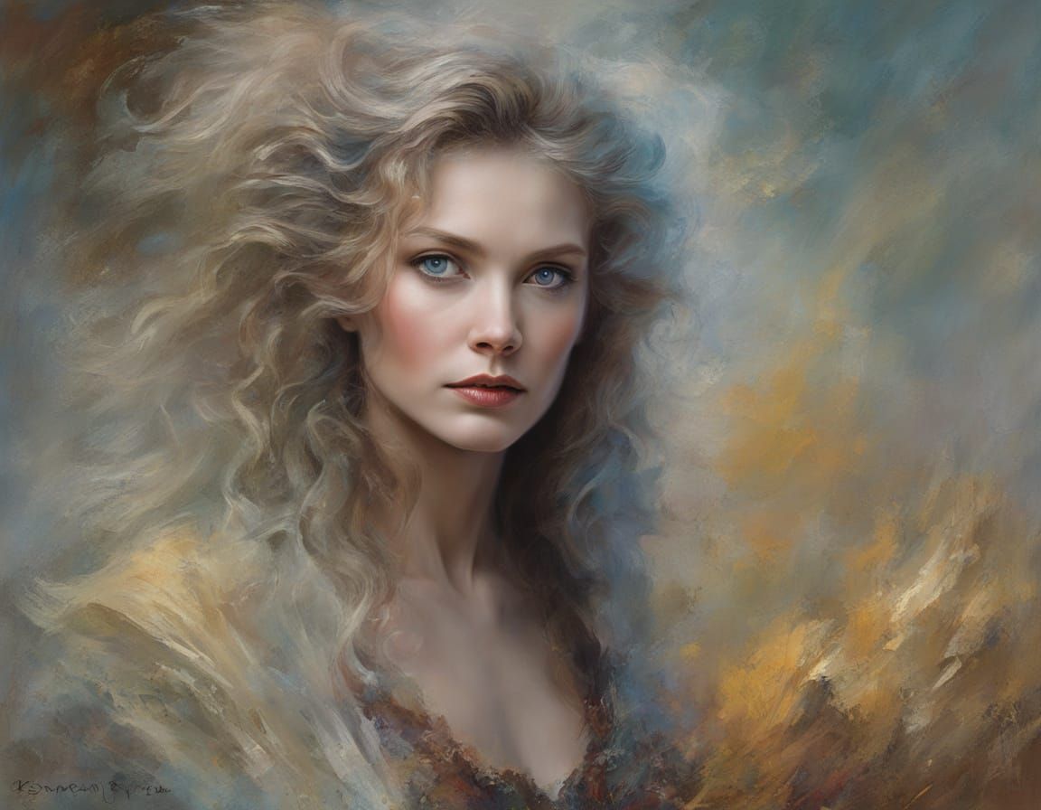 A hyperrealistic portrait resembling a movie poster. The image features impasto and chalk art techniques with a dreamy, dynamic feel, rendered in high detail with complementary colors.