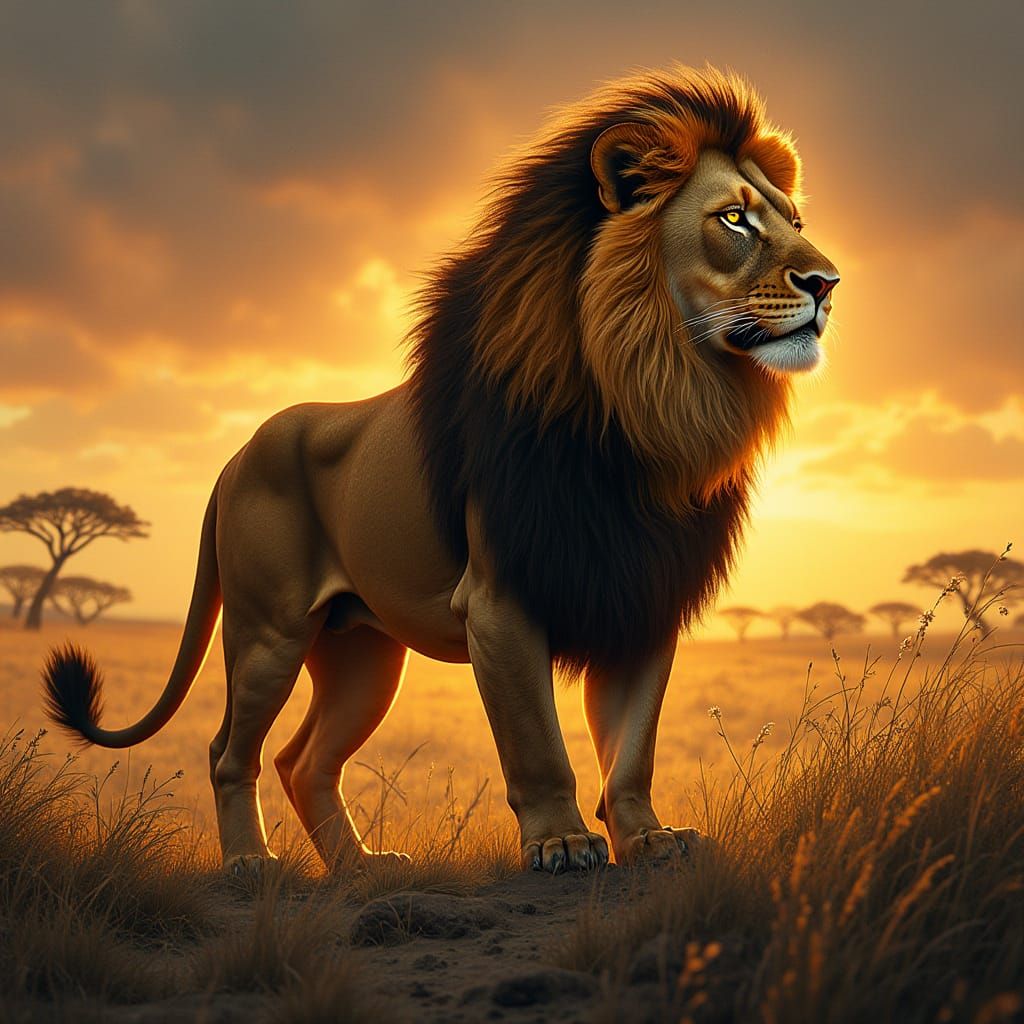 A striking picture of a lion with tribal markings standing in a savanna. The image blends art nouveau elements with organic and fantastical aspects in a modern digital art style.