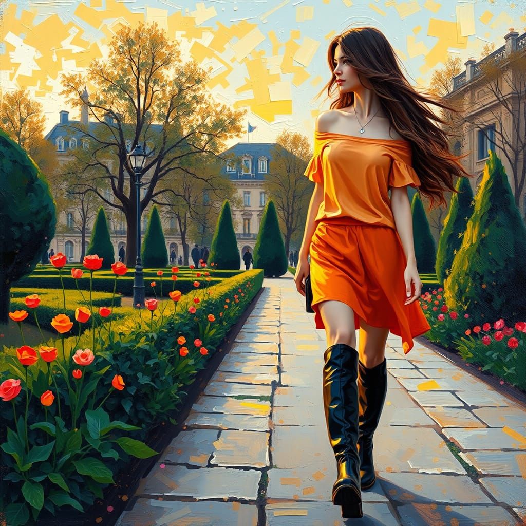 This oil painting depicts a woman in a vibrant orange outfit walking through Parisian gardens during golden hour. It features thick, textured paint and dynamic brushstrokes in a neo-impressionist and expressionist style.