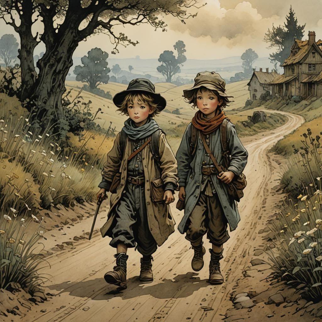 This image shows two young vagrants journeying down a dusty rural road. The artwork evokes a whimsical storybook illustration style.