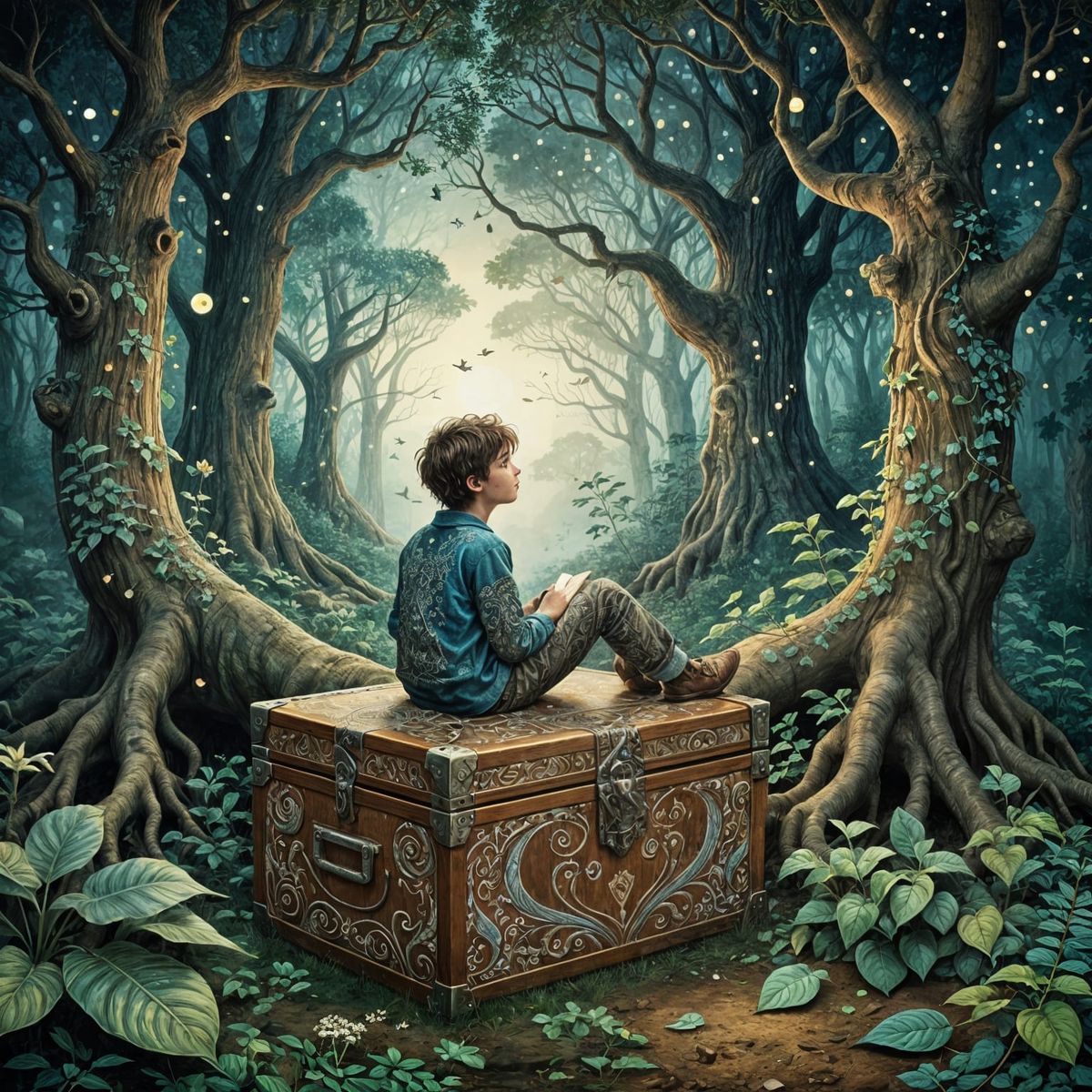 A striking picture of a boy sitting on a treasure chest at the base of a tree. The artwork features detailed linework and dreamy colors, in a surreal watercolor style.