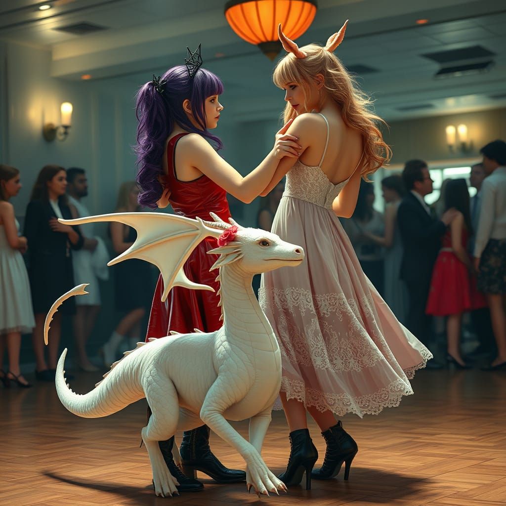 This image shows two goth girls dancing at a high school prom. One has purple hair and is wearing a red leather dress, while the other wears a white lace dress, all with intricate details and soft lighting in a cinematic style.