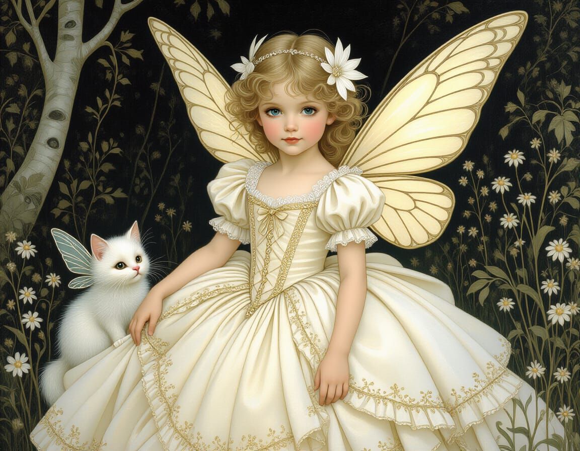 This image shows a Victorian girl in a ball gown with fairy wings and a magical pet. It evokes a whimsical, fantasy style with intricate details and soft lighting.