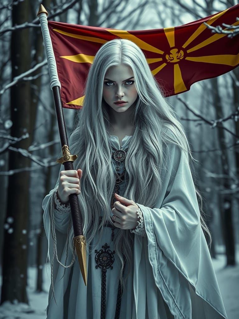 A hyperrealistic image of a beautiful yet menacing woman in white, standing in a snowy forest, holding a sword and waving the new Macedonian flag. Her intense gaze conveys victory in dramatic, dark fantasy style.
