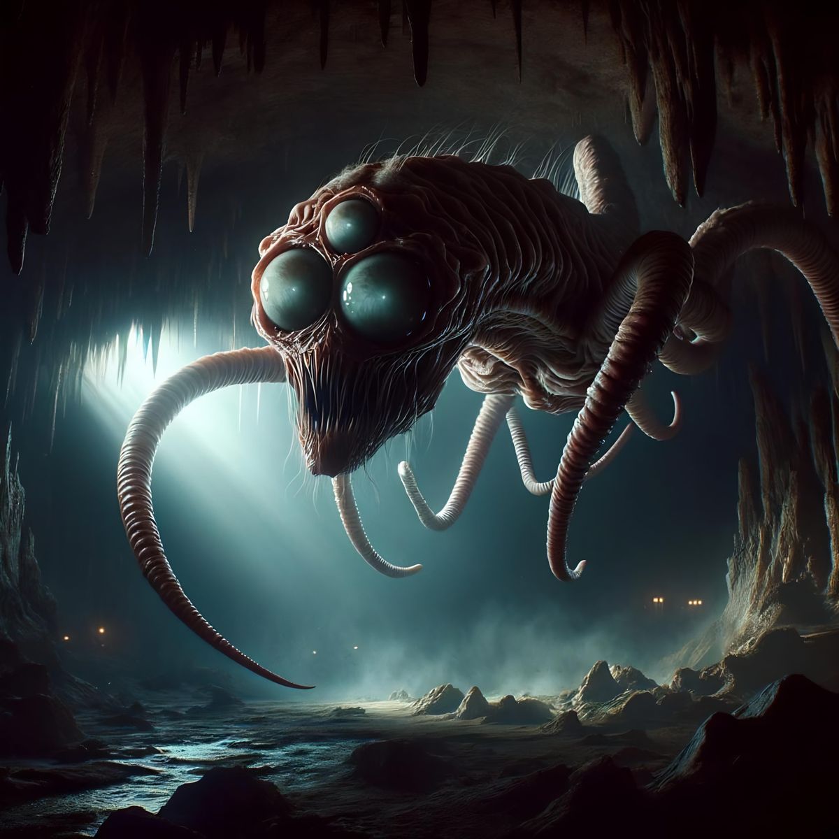 This image shows a hyperdetailed Lurking Strangler floating in a dimly lit underground cavern. The three-foot-long creature has two floating eyeballs connected by a striated muscle strand, with eerie shadows enhancing the ominous atmosphere.