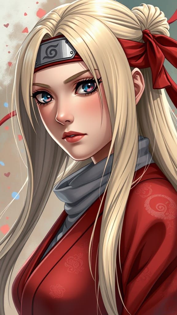 This image shows a photorealistic portrait of Tsunade, the Fifth Hokage from Naruto. The artwork captures her original character details with vibrant colors and intricate detail.