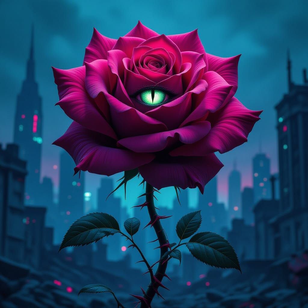 This image depicts a giant, crimson rose with a reptilian eye in its center, blooming over a decaying cyberpunk city. It features hyper-realistic cyber-Gothic detail and dramatic neon-noir lighting.