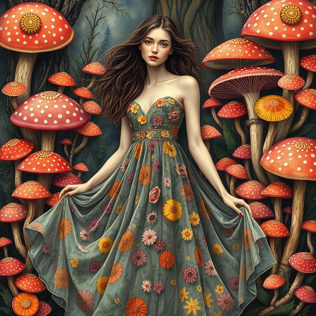 This image shows a woman amidst a fantastical forest of colorful mushrooms, with intricate textures and earthy tones creating a whimsical atmosphere reminiscent of a fantastical world.