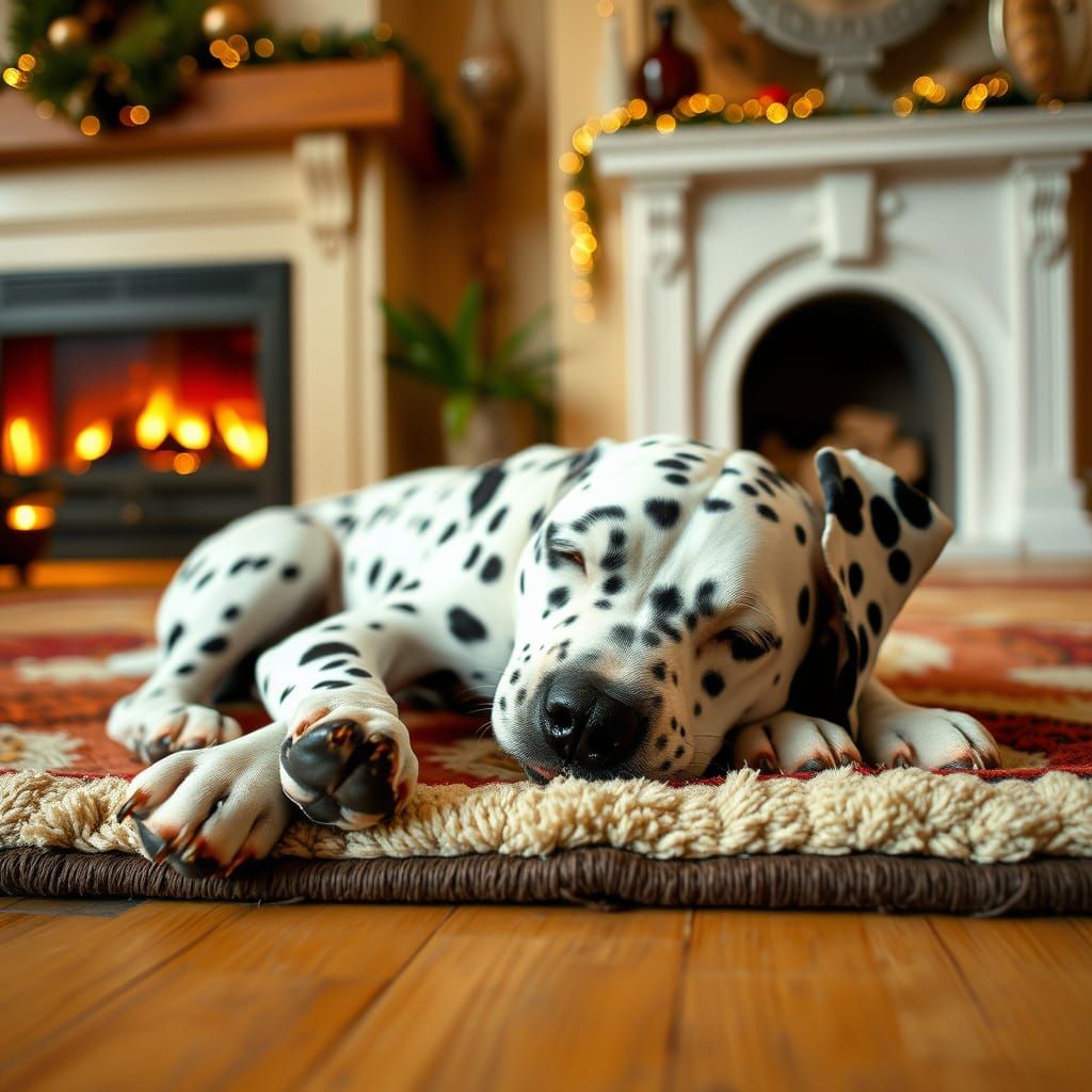 This image shows a polka-dotted Dalmatian puppy napping on a cozy rug next to a lit fireplace. The living room setting adds to the warmth and comfort of the scene.
