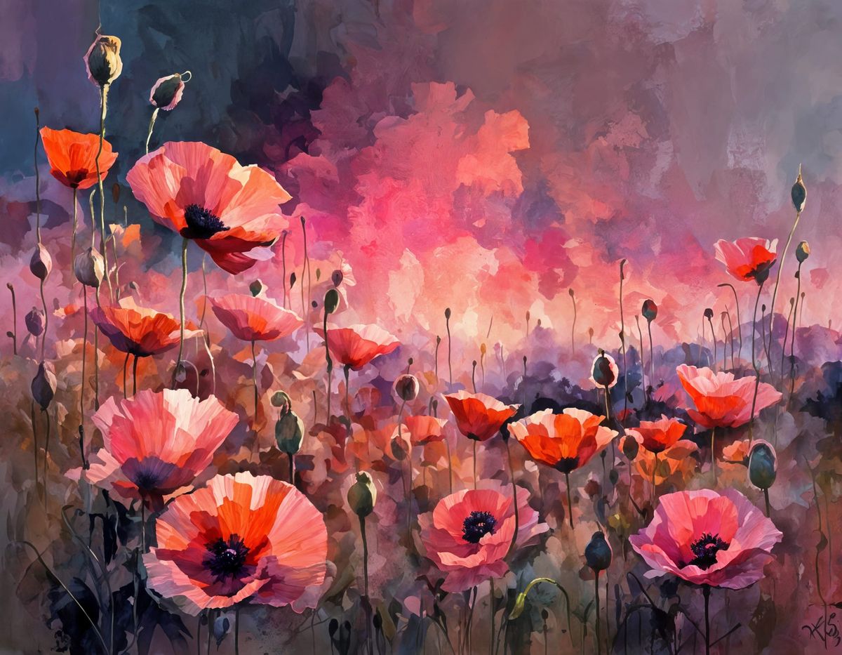 This image is a captivating depiction of poppies bathed in the warm, pink hues of an evening sky. The artwork combines the dreamlike quality of Impressionism with the intricate details of modern digital art.