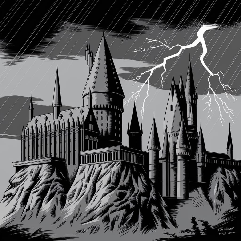 A dark, noir picture of Hogwarts Castle during a storm. The castle's towers are illuminated by lightning in this image, which is reminiscent of the style of Fables comics.