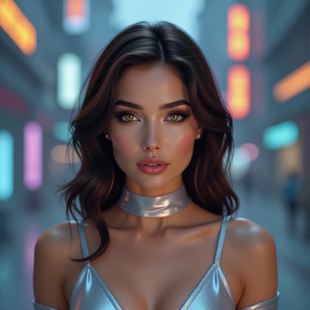 This image shows a digital portrait of a woman with copper eyes in a silver dress. The artwork features a cyberpunk aesthetic with neon lighting and futuristic elements.