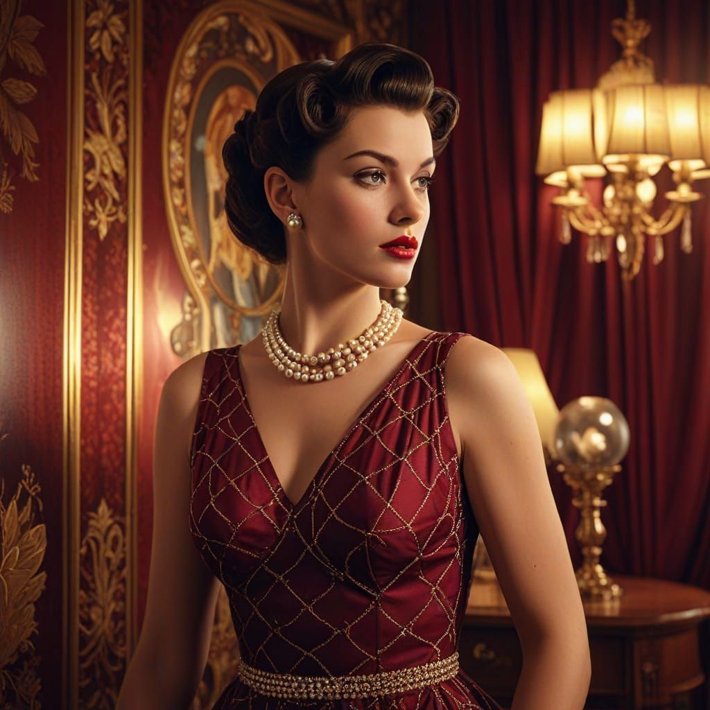 A digital painting of a 1950s pin-up woman in a vintage room. The image features intricate patterns, glowing pearl jewelry, and soft, golden light, rendered with cinematic colors.