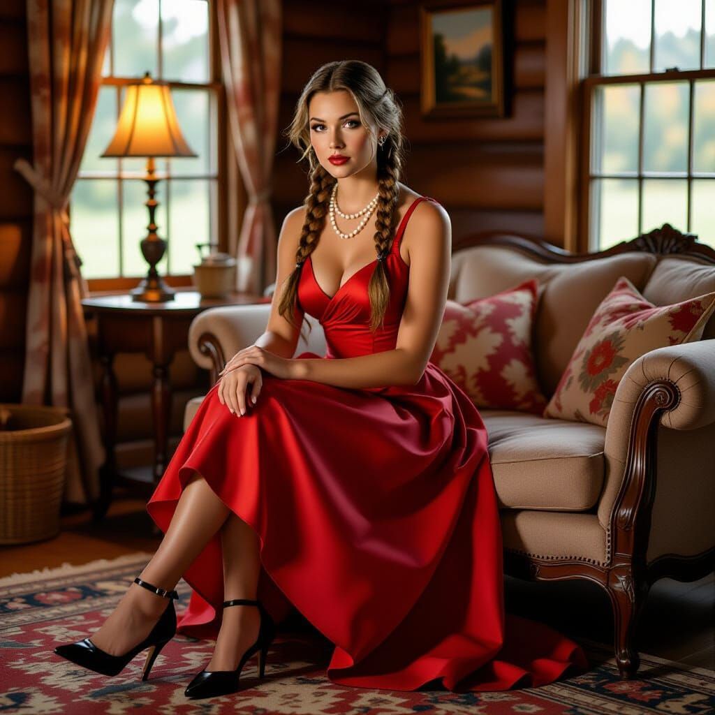 This image shows an awkward farmgirl dressed up for prom. The cozy, vintage Americana style is reminiscent of classic American painters, with a warm lighting that adds to the nostalgic charm.