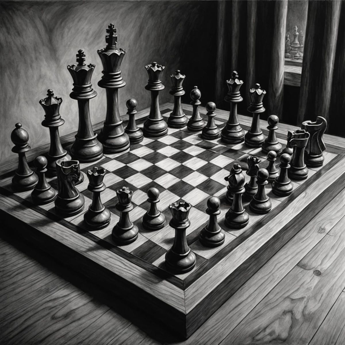 A hyperdetailed charcoal drawing of a chessboard. The intricate details of the board and pieces are rendered with precision and depth using charcoal drawing techniques.