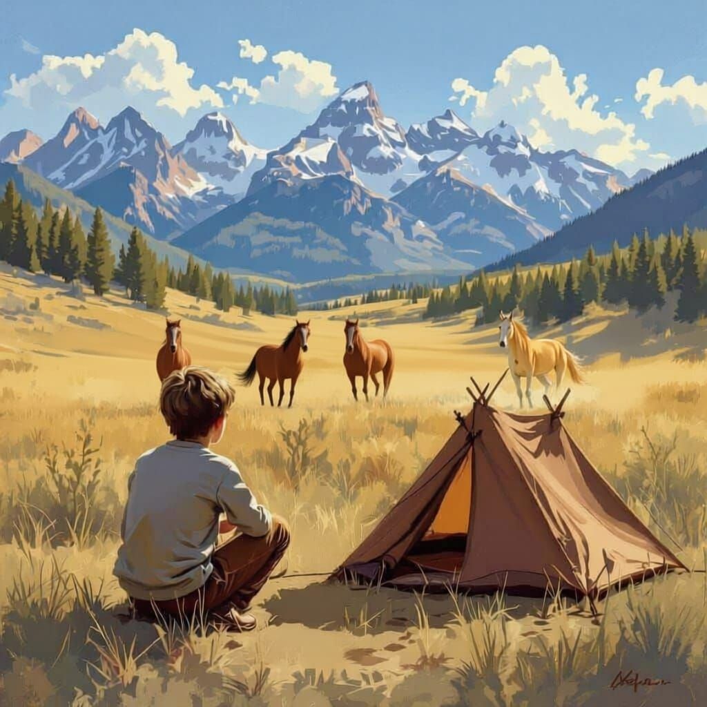 This digital painting captures a young boy observing twelve spotted mustangs in a vibrant Montana setting. Featuring golden hour light and textured brushstrokes, it evokes a sense of dynamic movement.