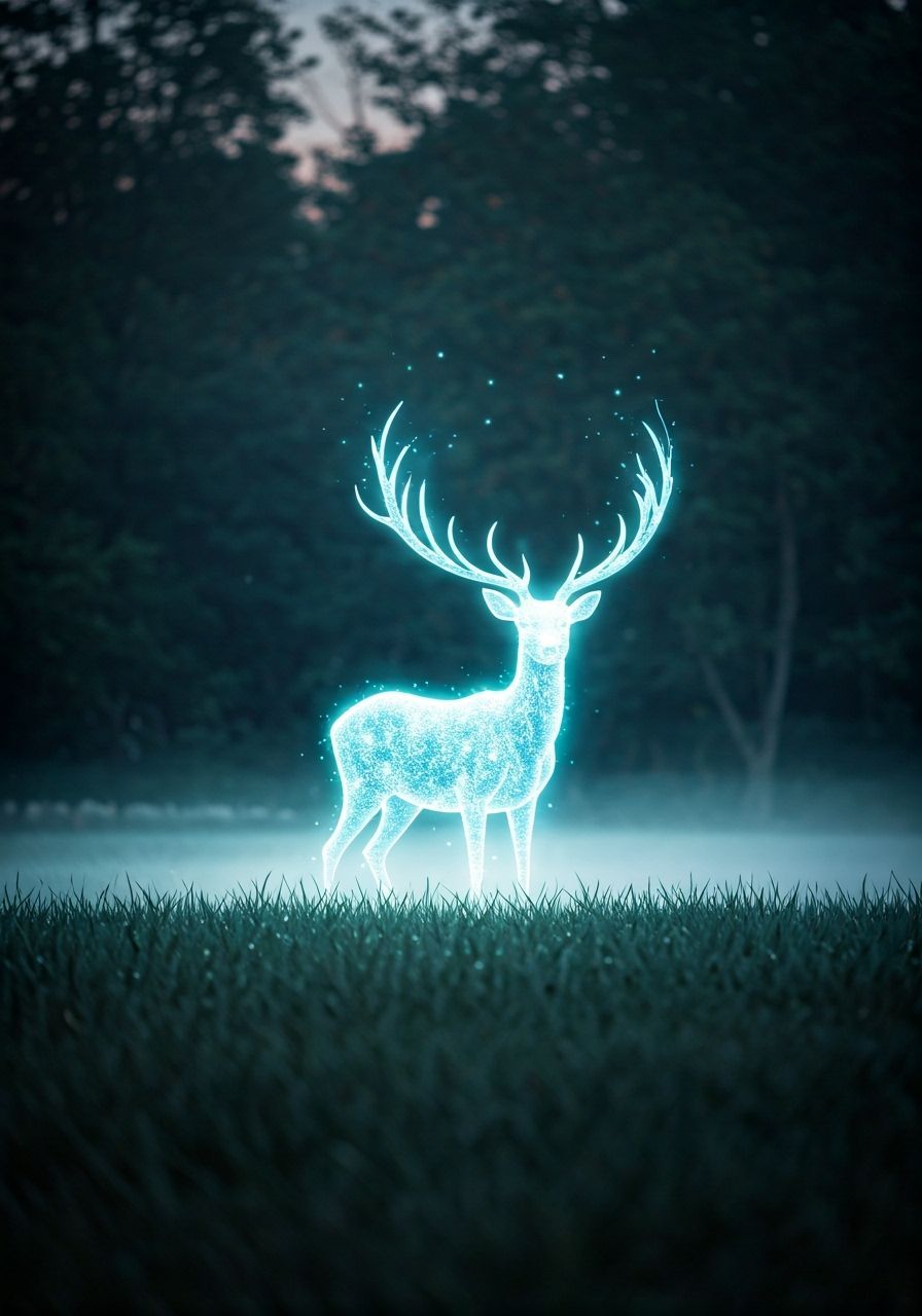This photorealistic image captures a stunning white stag appearing through dense morning fog. The scene is breathtaking and filled with magical, shimmering light.