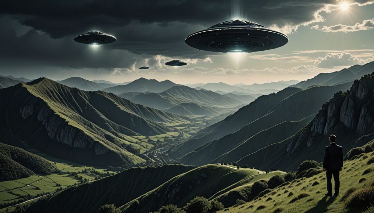 This image shows a cinematic alien landscape in the Basque Country, Spain, featuring scenic mountains, misty valleys, and subtle sci-fi elements. It evokes a suspenseful and eerie atmosphere.
