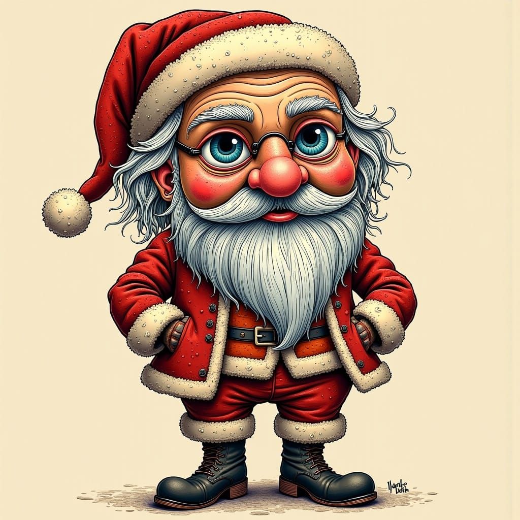 This image shows a folk-art Santa Claus with exaggerated features and big blue eyes, created as digital art. It features a whimsical, clustered zentangle aesthetic with muted colors accented by bright hues.
