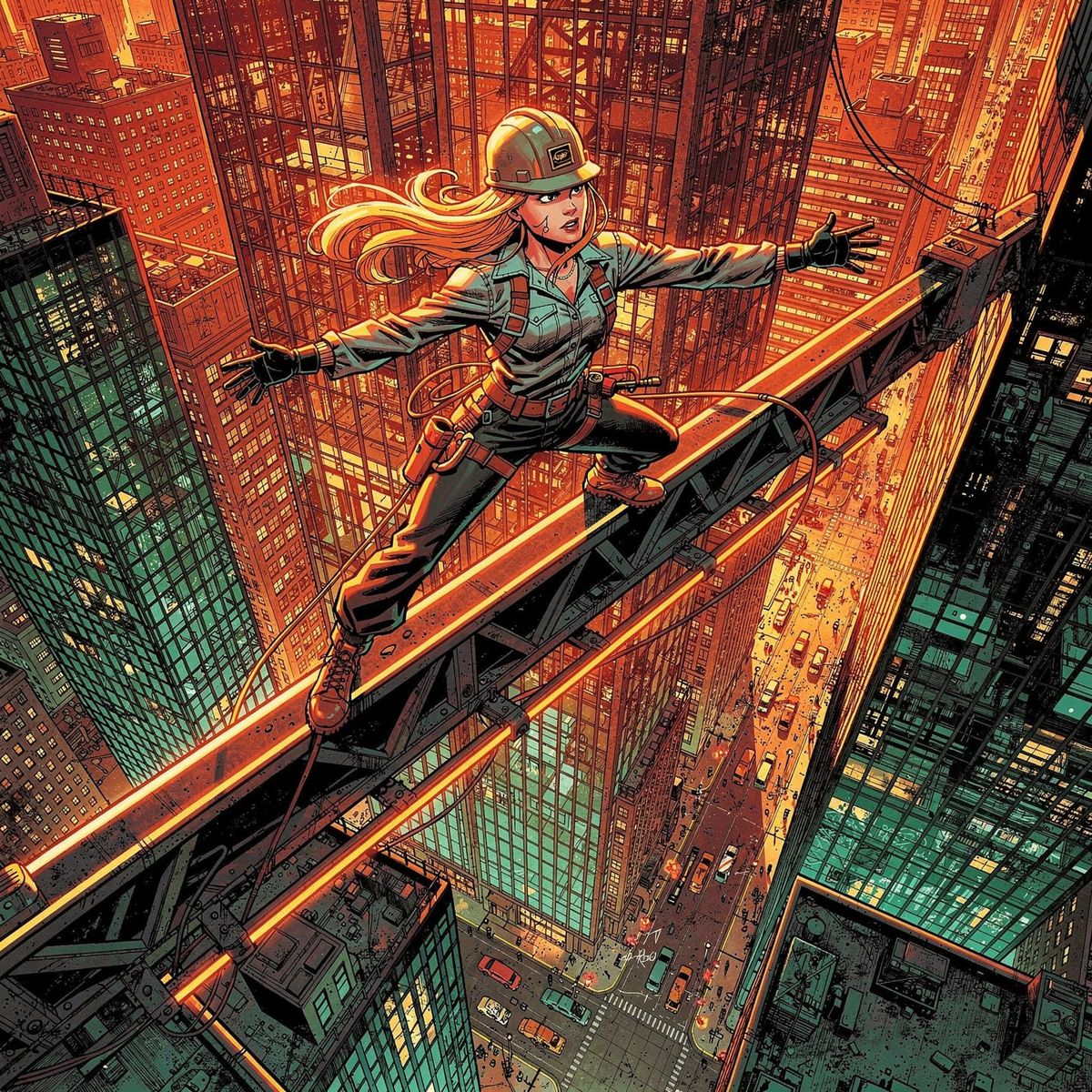 A hyper-detailed image of Tricia Helfer as a skyscraper worker experiencing vertigo. Features bold lines, deep contrast, and vibrant red, amber, yellow, and teal colors, in a comic art style.