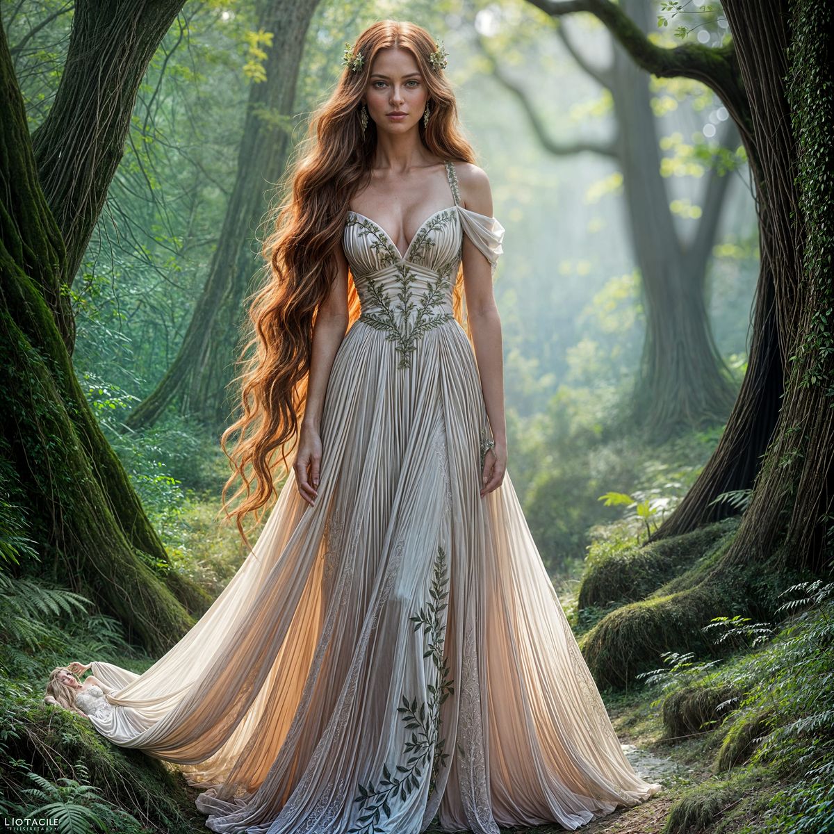 A striking picture of a red-haired supermodel in an elven-inspired couture gown. The gown features intricate embroidery and flowing chiffon, reminiscent of woodland elven queens.