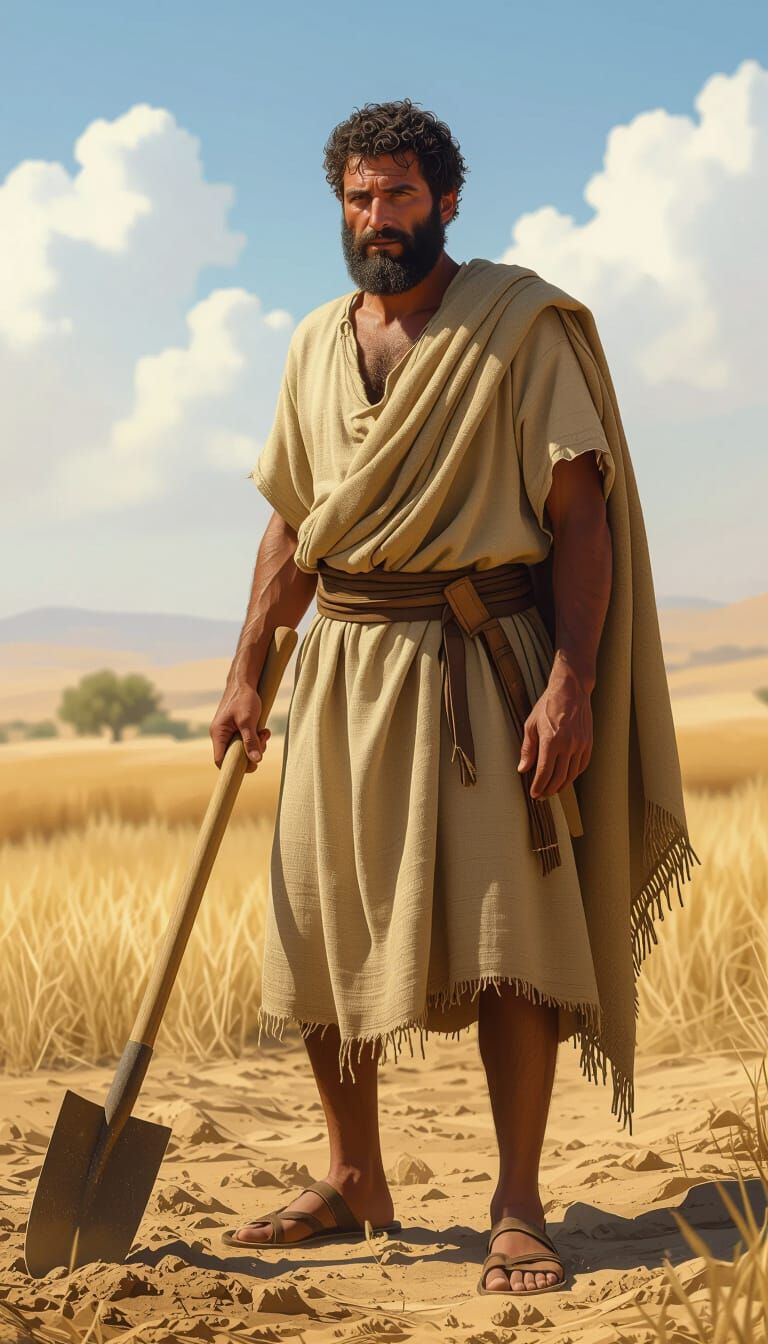 This image shows a sun-kissed Judean farmer from the 1st century CE in a dusty field. The artwork evokes a cinematic and atmospheric style with vibrant colors, intricate textures, and detailed matte painting techniques.