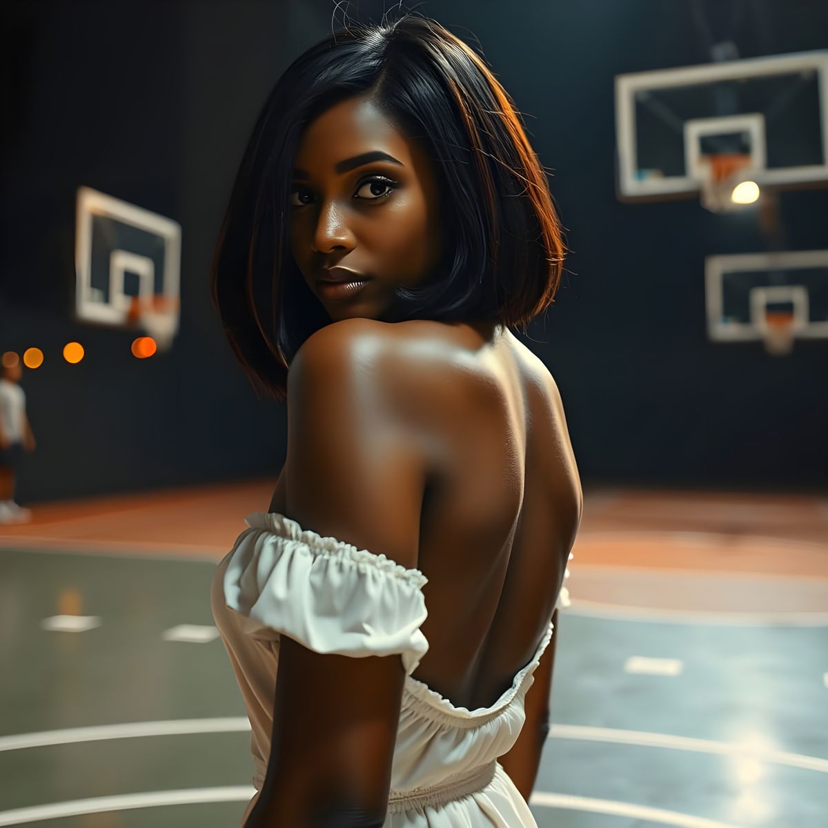 This image shows a beautiful young Black woman with bronde hair in a white dress, posing on a dimly lit basketball court at midnight. The artwork is a dramatic, atmospheric digital matte painting.