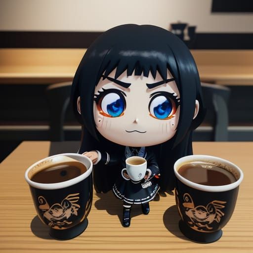 This 3D anime art depicts a chibi caricature of Giorgia Meloni serving coffee to shadowy figures. Features vibrant colors and eerie shadows with dramatic lighting.
