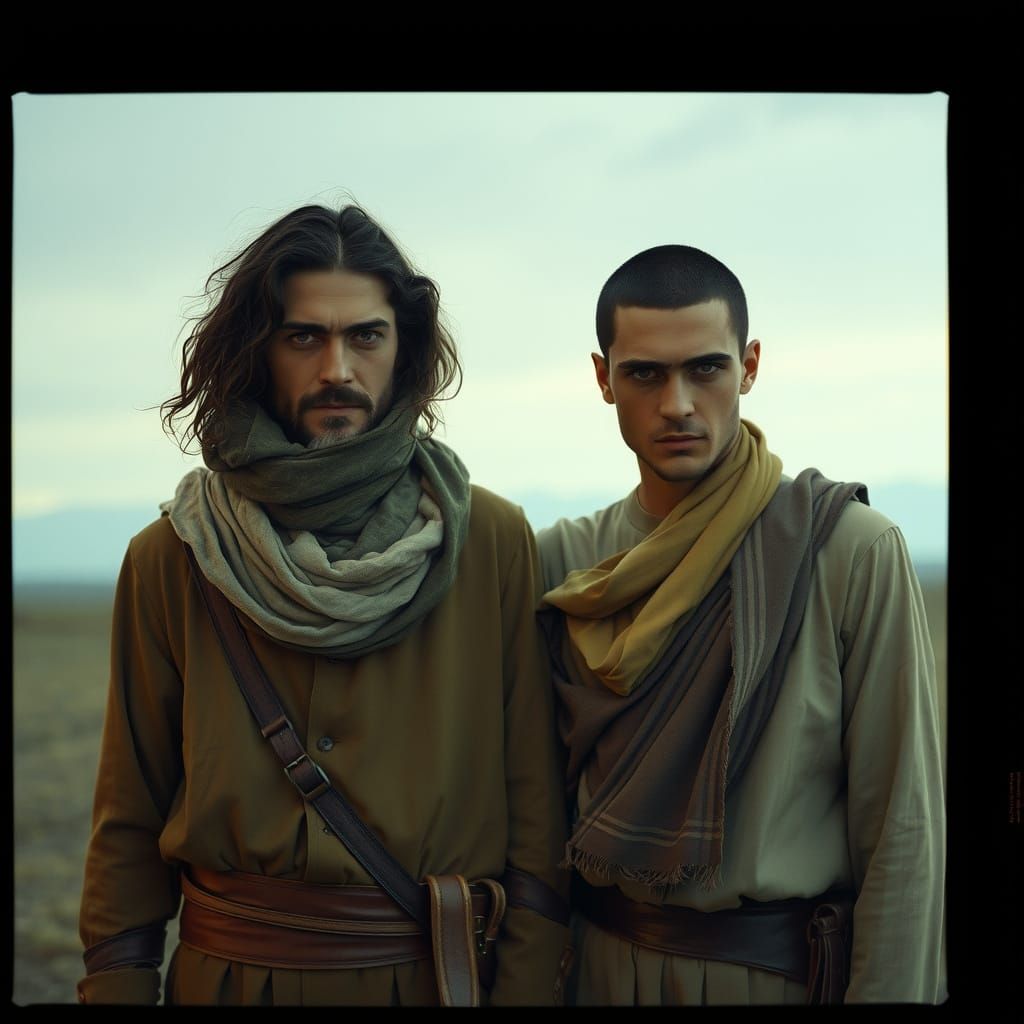 A dramatic film still featuring two figures in worn clothing against an atmospheric backdrop. The image is reminiscent of classic film, with intense gazes and cinematic lighting.