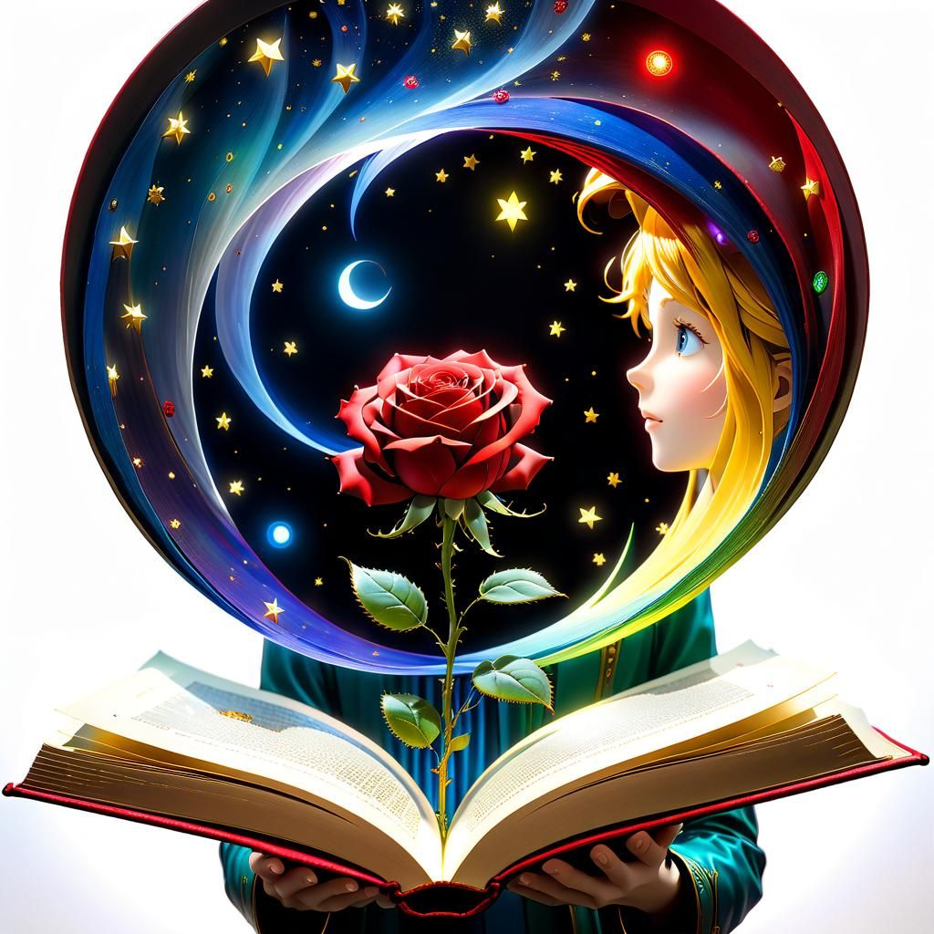 A vibrant image of an open book with the Little Prince escaping, accompanied by a red rose. Evokes a magical mood using volumetric lighting and a mix of alcohol ink and watercolor.