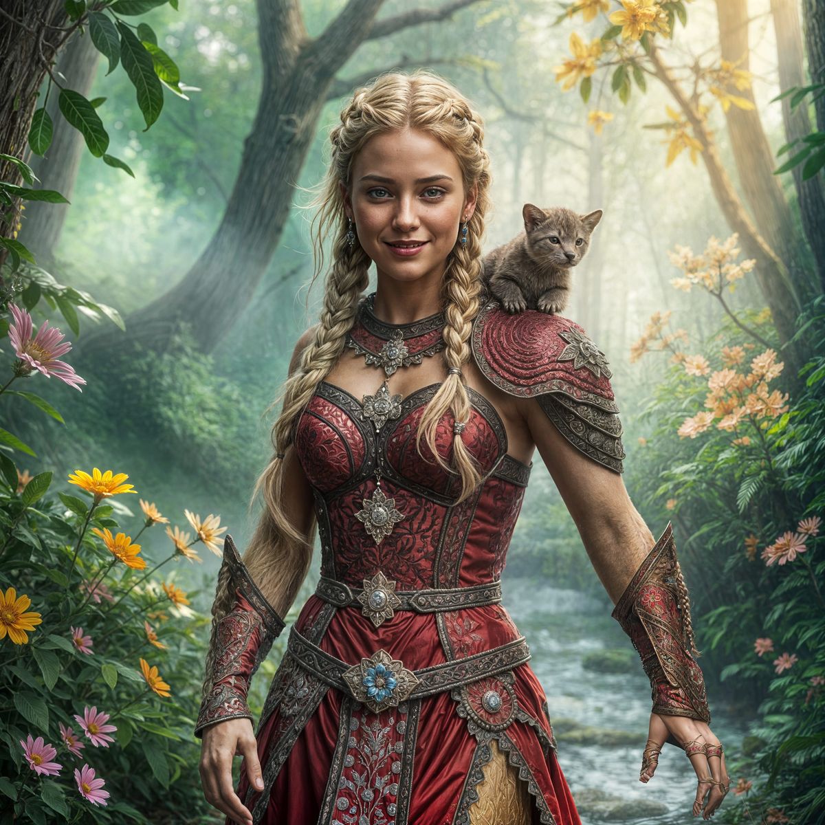 A hyperrealistic image of a smiling warrior princess in detailed red armor, with a cute furry animal on her shoulder, walking through a foggy forest with big flowers and intricate lighting.