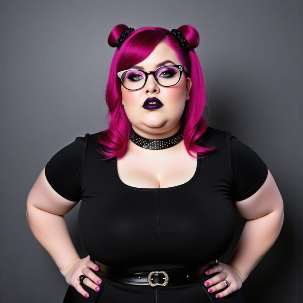 A striking image of a plus-sized goth woman, adorned in dark colors, with a prominent belly, double chin, and stylish eyeshadow, set against a mysterious backdrop.