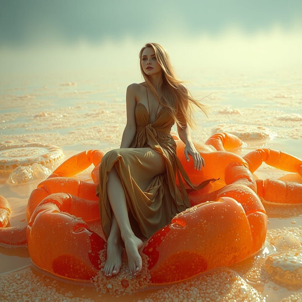 A surreal image depicts a young woman with golden hair sitting on a giant gummy crab in a fizzy soda sea. The scene features warm golden hues and soft focus, in a neon futurist style.