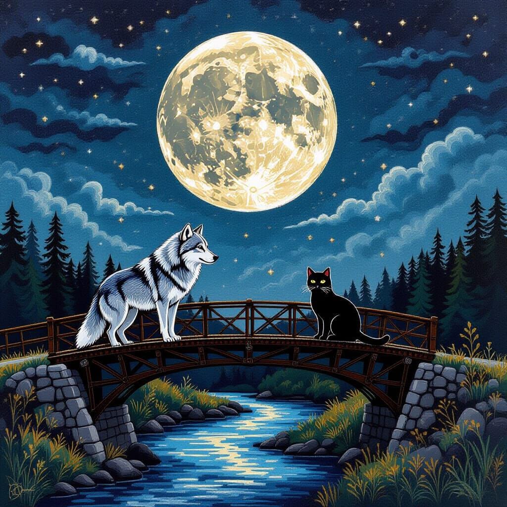 A night scene on a bridge under a full moon, featuring a wolf and cat. The art evokes wet, corrugated silk embroidery on linen with pearls and metallic threads, with a powdery, cinematic finish.