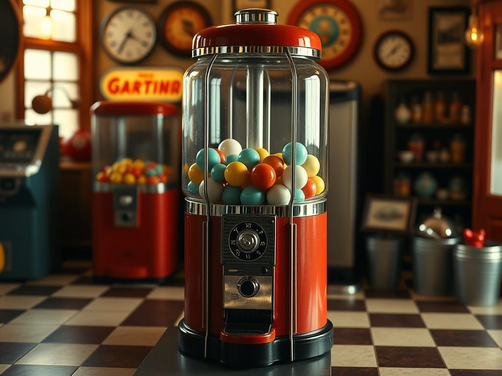 This image shows a hyperrealistic gumball machine rendered in a vintage style. The composition and textures are designed to showcase photorealistic detail.