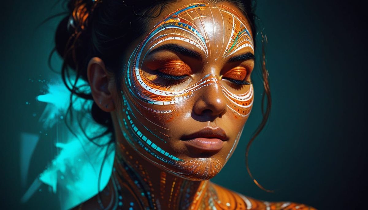 This image is a double-exposure fantasy portrait of a beautiful woman with a mix of traditional and digital art techniques, featuring contrasting colors and enigmatic lighting.
