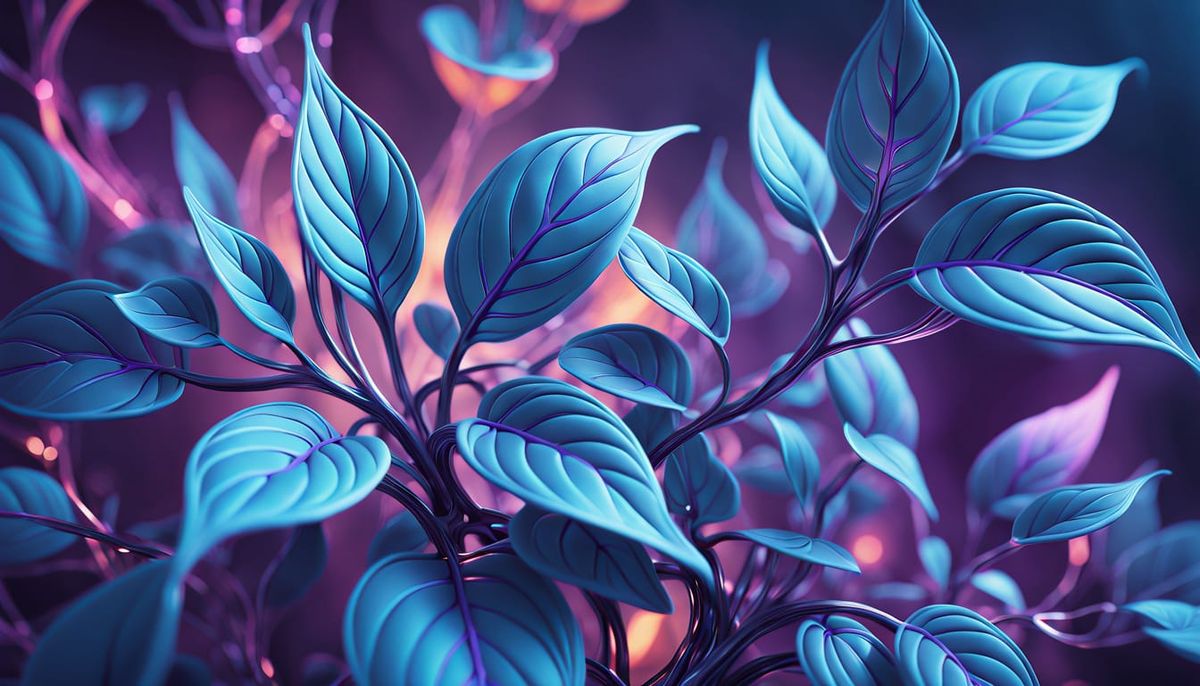 This image shows a detailed close-up of a cybernetic plant merging with a natural plant. The vibrant sci-fi art features glowing neon circuits and translucent leaves in an ethereal, iridescent style.