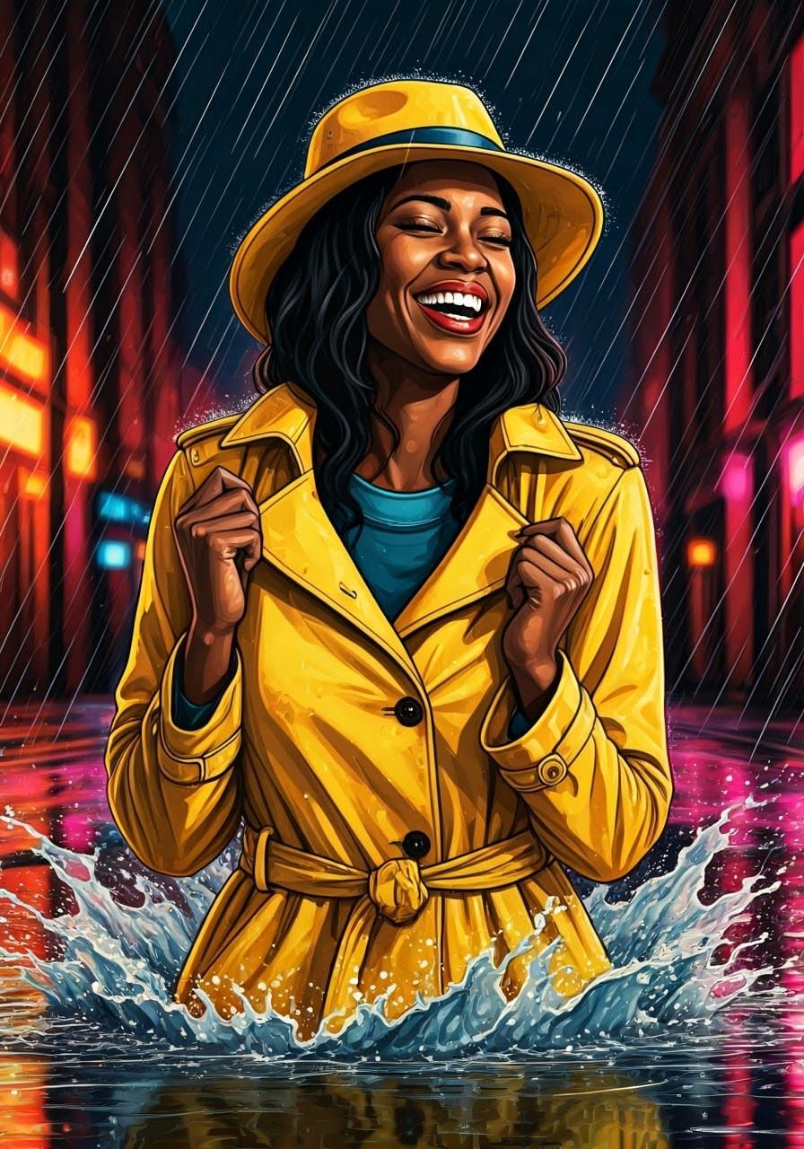 This image shows a joyful African American woman laughing and splashing through a rainy city street, surrounded by puddles and raindrops, in a vibrant ink drawing style with bold lines and liquid textures.