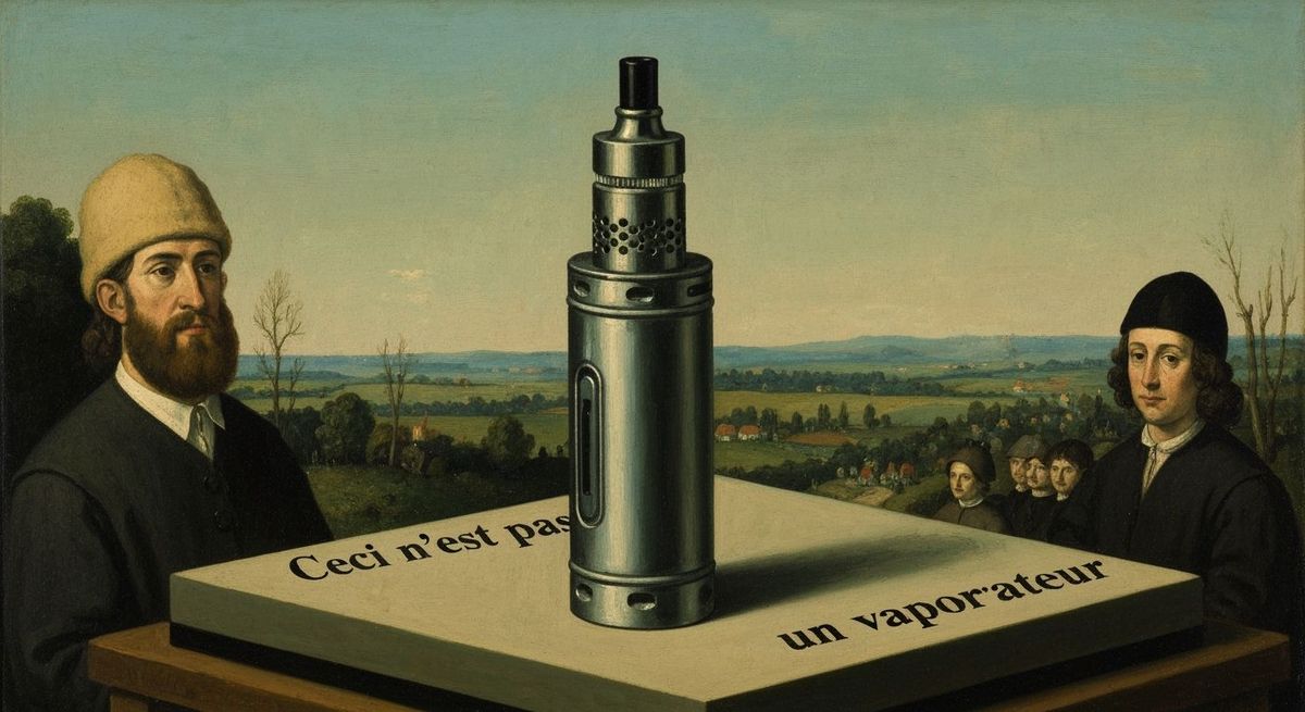 This image features a painted vaporizer with the phrase 'Ceci n'est pas un vaporisateur'. The artwork is rendered in a clear line style, evoking surrealist influences.