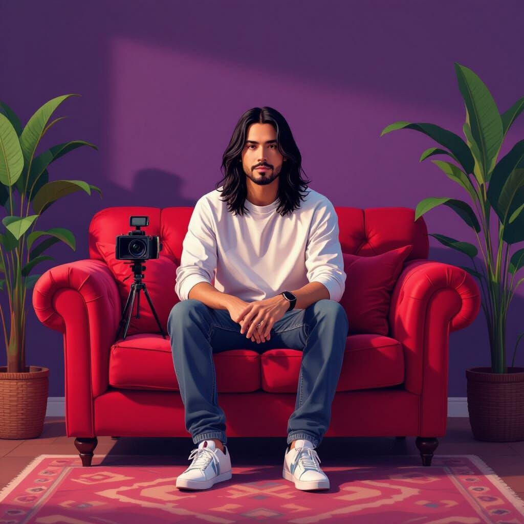 A hyperrealistic image of Mexican YouTuber Missa Sinfonia on a red sofa, with a webcam and plant. Cinematic lighting enhances the warm, dynamic violet background.