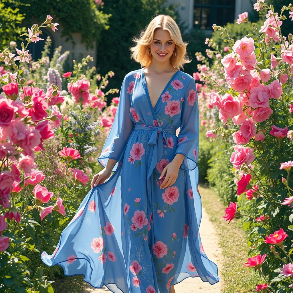 This image shows an elegant woman walking in a vibrant garden filled with delicate flowers, wearing a beautiful rose and light blue dress, evoking the refined femininity of Art Nouveau style